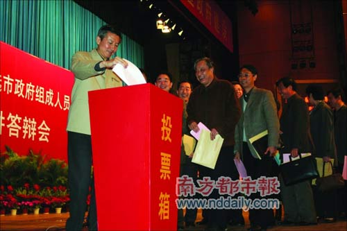 2月26日,南京舉行全市干部大會,與會者包括南京市四套班子領(lǐng)導(dǎo)成員、出席過黨的十七大和江蘇省十一次黨代會的代表等,共300多人。會上,人手一張選票,選票上有51個(gè)“填空題”:填寫51個(gè)部門區(qū)縣一把手的推薦人選,其中包括南京市政府47名組成人員人選和4位區(qū)(縣)委書記人選。