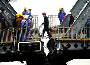 為保證外白渡橋移橋過程中橋梁結(jié)構(gòu)安全,移橋工作將分南、北兩跨分次進行。今天上午先移除南跨橋體,明后天移除北跨橋體。昨天下午,負責(zé)“移橋”的千噸駁船已進入金山路閘橋,?客獍锥蓸蛏嫌巍=裉焐衔9時10分,兩艘拖船將駁船拖至外白渡橋南跨橋體正下方,截至上午10時,駁船已開始頂升橋體。