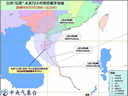 中新網(wǎng)4月17日電 中央氣象臺今天早晨六點鐘發(fā)布臺風(fēng)橙色警報:今年第1號臺風(fēng)浣熊(NEOGURI)的中心今天早晨5點鐘位于海南省三亞市東南方向大約480公里的南海中部海面上,就是北緯14.9度,東經(jīng)112.3 度,中心附近最大風(fēng)力有12級(35米/秒)。