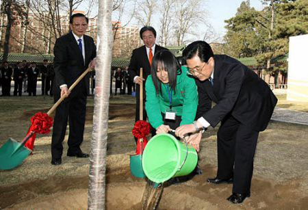 春天是播種希望的季節(jié)。胡錦濤專門來到中國人民大學百家園,同中日青少年代表一起種植友誼樹。