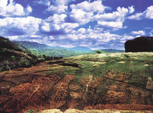 第一組巖畫在山坡西側(cè),南北長4米、東西寬2.8米,以人物和農(nóng)作物圖案為主。在人面與農(nóng)作物之間,還有鳥頭、鳥面、圓點(diǎn)、刻劃符號(hào)等。第二組在山坡南側(cè),南北長8米,東西寬6米,以星象、鳥獸圖案為主。第三組在山坡頂部,由人面像和各種符號(hào)組成。另外,在山坡頂部還有一大三小四塊大石頭,其中一塊上有許多人工鑿磨而成的圓窩,直徑在3——7厘米之間。(資料來源:連云港市政府網(wǎng)站)