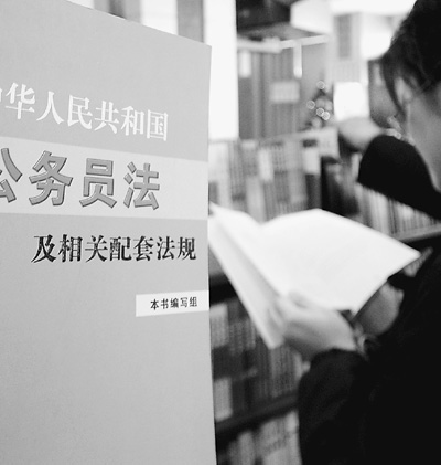 湖北宜昌一讀者在書店查看《公務(wù)員法及相關(guān)配套法規(guī)》讀本。吳明攝