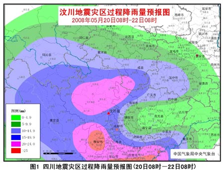 20-21日,震中及其附近地區(qū)將有一次中雨過程,四川汶川、北川、理縣、茂縣、綿竹等重災區(qū)的降雨量有8-22毫米,四川松潘、黑水、馬爾康以及甘肅文縣降雨量可達25-40毫米(圖1),并伴有短時雷電、雷雨大風等強對流天氣。22日,震區(qū)還將有2-8毫米的降雨(圖2)。需注意局地強降雨給抗震救災工作帶來的不利影響。