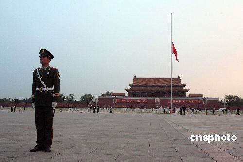 中新網(wǎng)北京5月19日電 五月十九日凌晨四時(shí)五十七分四十秒,北京天安門廣場(chǎng)下半旗,沉痛哀悼在汶川特大地震中的遇難者。