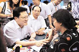 記者發(fā)現(xiàn),社會(huì)與勞動(dòng)保障局和國(guó)土房管局的接訪點(diǎn)前“人氣”極旺,隊(duì)伍都排到了別的局“攤位”前。當(dāng)然,全場(chǎng)最忙的要屬市長(zhǎng)張廣寧。由于要跟他“面談”的市民太多,警察不得不筑起一道人墻,留出一條市民排隊(duì)的通道以維持現(xiàn)場(chǎng)秩序。