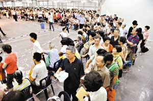 盡管昨天一整天都陰雨連綿,但從早上7時(shí)開(kāi)始,錦漢展覽中心2號(hào)館外便已是人頭攢動(dòng),冒雨等候的隊(duì)伍從入口處綿延數(shù)百米,來(lái)訪市民以老人居多。