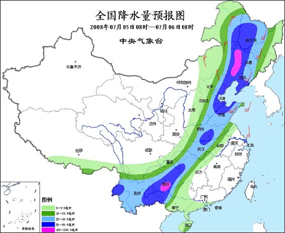 7月5日08時至7月6日08時,西藏南部和東部、甘肅東南部、陜西大部、內(nèi)蒙古中東部、東北大部、華北、黃淮、江淮大部、江漢、湖南西部和北部、西南地區(qū)、廣西中西部、廣東西南部沿海、海南等地有小到中雨或雷陣雨,其中,內(nèi)蒙古東部、東北中西部、華北東部、黃淮大部、江漢地區(qū)大部、湖南西北部、重慶東部和南部、四川南部、貴州大部、云南大部、廣西西部等地有大到暴雨,局地有大暴雨,上述部分地區(qū)并伴有短時雷雨大風或冰雹等強對流天氣。內(nèi)蒙古東北部、東北地區(qū)有4~5級偏南或偏北風,渤海、黃海、東海北部有5~6級偏南風。