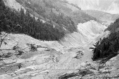 從百花大橋出口處山路行進幾公里,到了牛圈溝。進入溝內(nèi)不久,專家們被兩邊的情景驚呆了,這里更像是冰川遺跡:一大堆土石組成的固體流從兩公里外的一條支溝傾泄而來,將所過之處掃得精光,兩道棱角分明的沖刷印跡,如刀削般留在溝兩邊的山體上;山體印跡以上樹林茂密,少有損傷;印跡之下,只有堆堆土石。固體流在傾泄過程中,曾受到山體阻攔,產(chǎn)生了三次折向,折向處有明顯的上揚跡象,最高處達60米。