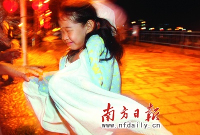海陵島上的小游客在狂風(fēng)中艱難行走。本報(bào)記者朱丹陽梁文祥攝