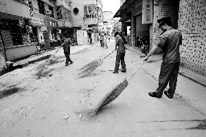 黃埔區(qū)幾名城管隊員在港灣東一街清掃街道。