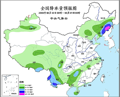 2008年8月18日08時(shí)—8月19日08時(shí) 全國降水量預(yù)報(bào)圖