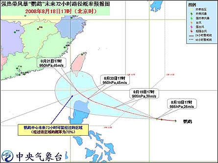 預(yù)計強風(fēng)暴中心將以每小時20-25公里的速度向西偏北方向移動,強度繼續(xù)加強,逐漸向臺灣東南部海面靠近。受其影響,19日白天,巴士海峽、巴林塘海峽、臺灣以東洋面的風(fēng)力將逐漸加大到6-8級。