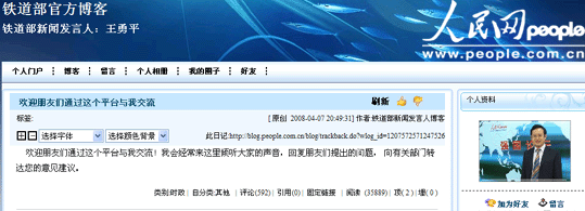 今天下午,有網(wǎng)友在人民網(wǎng)鐵道部新聞發(fā)言人王勇平的博客里留言:“王部長,您好!據(jù)說,今年9月青藏鐵路將開行豪華旅游列車。這種豪華旅游列車只對外國人開放。這一消息屬實嗎?有沒有更多的情況提供?”,王勇平在第一時間回復(fù)了該網(wǎng)友。