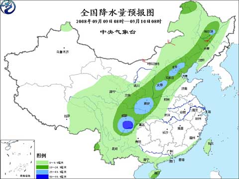 2008年9月9日8時(shí)-10日8時(shí)全國降水量預(yù)報(bào)圖