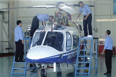 機務(wù)人員在對一架直升機進行保養(yǎng)檢查工作。本報記者 董世彪 攝