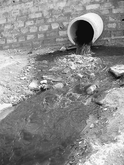 記者溯水而上,發(fā)現(xiàn)正在建設(shè)的陜煤集團(tuán)神木檸條塔礦業(yè)有限公司,在龍泉村附近有一根直徑約80厘米的大塑料管伸向河道,管子里嘩嘩地流著一股有濃烈異味的黑水(見圖②),從正在打的礦井未經(jīng)處理就排到河道,與上游流下來的水匯合時(shí)有一條明顯的線,可謂涇渭分明。