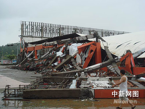 圖為市區(qū)一家具商場的門面被風雨摧毀。