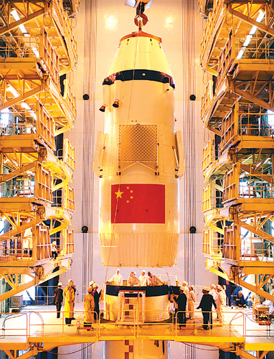 神舟七號(hào)飛船正在組裝。