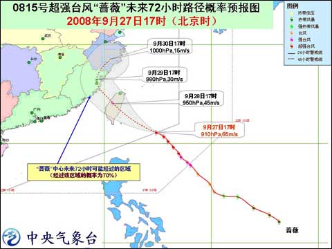 中新網(wǎng)9月27日電 據(jù)中國天氣網(wǎng)消息,中央氣象臺2008年9月27日18時發(fā)布臺風(fēng)紅色警報(bào)稱:預(yù)計(jì),今年第15號超強(qiáng)臺風(fēng)“薔薇”將以每小時20-25公里的速度向西北方向移動,逐漸向臺灣東部一帶沿?拷瑢⒂诿魈熘形绲揭归g在臺灣宜蘭到臺東一帶沿海登陸。