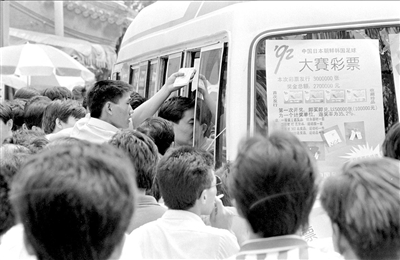 集中銷售彩票的模式開展起來。當(dāng)時,福彩、體彩的人拉著電視機、洗衣機、自行車等,到農(nóng)村的集市或者城市的廣場上售賣。人們管這種彩票叫“刮獎”,買到后,只需用指甲刮開,便知道自己是中了自行車、洗衣機,還是一無所獲。