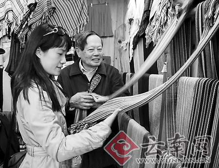 下午5時多,楊振寧和翁帆一行來到麗江古城木府附近“天雨流芳”古牌坊下,突然又轉(zhuǎn)頭往回走。原來,一家民族服飾小店吸引了他。這家店主營手工編織的民族圍巾,身著民族服裝的小姑娘一邊還在用手工編織著這些產(chǎn)品。楊振寧拉著圍巾摸了又摸,看了又看,將圍巾搭到翁帆的脖子上試了又試。