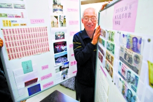 從2元的1995年版公交月票,到30元的2004年版公交月票,糧票、油票、工資條、彩票、選民證等,柯富海老人的100多件收藏品,在西花市大街南里居委會(huì)林林總總擺滿了三面墻。這是一位花甲老人的“個(gè)人改革開(kāi)放30周年展”。