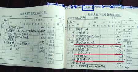 翻開(kāi)劉元九1982年的賬本,在“衣物支出”一欄內(nèi)可以清楚地看到:11月4日給建英(劉元九妻子)買(mǎi)一雙布鞋,3元。12月20日割花布兩尺,1元。這一年,劉元九一家三口買(mǎi)衣服總共花了20.72元。