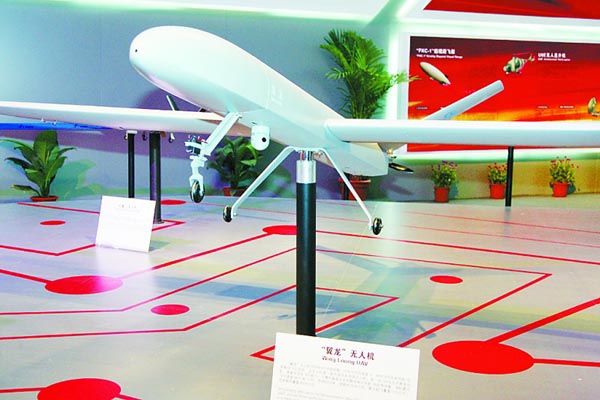 “翼龍”無人機是惟一完成飛行試驗的 “真機”,不過此次展出的亦是一比一的模型,瘦削簡潔的機身和長度驚人的機翼讓“翼龍”無人機的外形和美軍“掠食者”武裝無人機頗為相似。