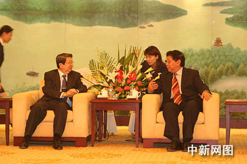 中國政協(xié)副主席鄭萬通在江蘇溧陽會見應(yīng)邀前來參加二00八年“一村一品”國際研討會的的柬埔寨王國副首相兼內(nèi)閣辦公廳大臣索安。 作 者:李建軍