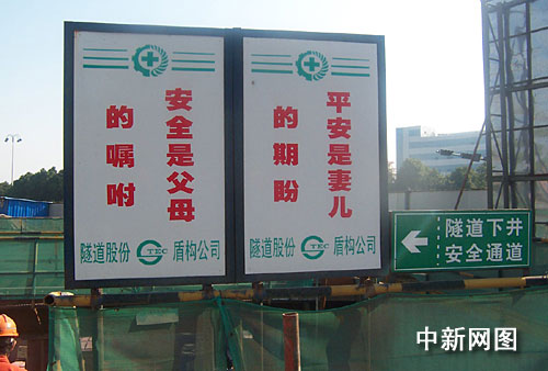 在地鐵施工現(xiàn)場(chǎng),安全標(biāo)語高高樹立。 作者:汪恩民