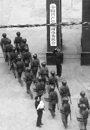 不法分子在前院縱火焚燒了市委保安室和信訪接待室,以及停放在前院的摩托車、自行車和砸壞的辦公用品,并將前來救火的一輛消防車強(qiáng)行搶奪開進(jìn)大院,后被制止。之后,武警戰(zhàn)士和公安民警將聚集人員清理和疏散出市委大門,凌晨4時左右,事態(tài)暫時得到控制。