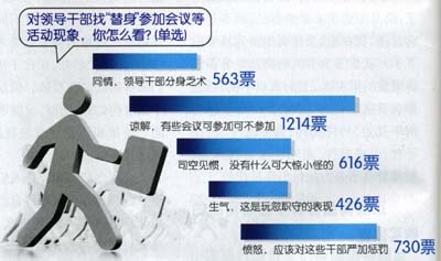 “你認(rèn)為領(lǐng)導(dǎo)干部找‘替身’開(kāi)會(huì)對(duì)工作是否有影響?”問(wèn)卷調(diào)查結(jié)果顯示,46.56%的受調(diào)查者認(rèn)為“有影響,規(guī)定‘一把手’參加的會(huì)議自有其道理”,24.34%的受調(diào)查者認(rèn)為“很難說(shuō),要看具體情況而定”,29.1%的受調(diào)查者認(rèn)為“沒(méi)有影響,只要將會(huì)議的主要精神傳達(dá)到了就可以”。