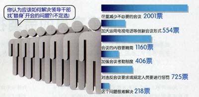 “你認(rèn)為應(yīng)該如何解決領(lǐng)導(dǎo)干部找‘替身’開(kāi)會(huì)的問(wèn)題?”問(wèn)卷調(diào)查結(jié)果顯示,65.03%的受調(diào)查者認(rèn)為“盡量減少不必要的會(huì)議”,37.7%的受調(diào)查者認(rèn)為“會(huì)議的內(nèi)容要精簡(jiǎn),有的放矢”,23.56%的受調(diào)查者認(rèn)為“對(duì)找‘替身’開(kāi)會(huì)的現(xiàn)象加大管理力度,對(duì)相關(guān)人員要進(jìn)行懲罰”,18%的受調(diào)查者認(rèn)為“加大運(yùn)用電視電話(huà)等創(chuàng)新會(huì)議形式”。由此可見(jiàn),表示應(yīng)減少會(huì)議或精簡(jiǎn)會(huì)議內(nèi)容的占到受調(diào)查者的88.59%。
