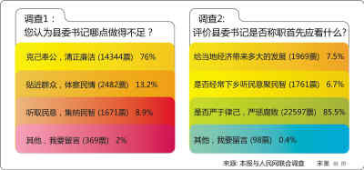 記者:來這里之前,我們和人民網(wǎng)做過一個(gè)調(diào)查,有76%的網(wǎng)友認(rèn)為,現(xiàn)在的縣委書記在“克己奉公,清正廉潔”這方面做得不足。請各位談?wù)劵鶎印耙话咽帧钡谋O(jiān)督現(xiàn)狀?