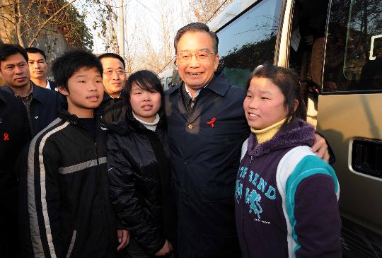 11月29日,中共中央政治局常委、國(guó)務(wù)院總理溫家寶專程來(lái)到安徽省阜陽(yáng)市,看望艾滋病患者、孤兒和基層醫(yī)護(hù)人員,了解艾滋病防治工作情況。 自2003年就任總理以后,溫家寶每年都抽出時(shí)間看望艾滋病患者和孤兒。