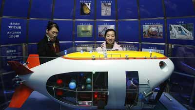 一條可愛的胖魚、卻張開著兩只大手臂,魚肚子里還趴著3個人,這是代表我國深海科技的7000米載人深潛器“和諧號”的最新樣機模型,昨天,在同濟亮相的這一海底“神七”通過演示臺展示了其操作原理。