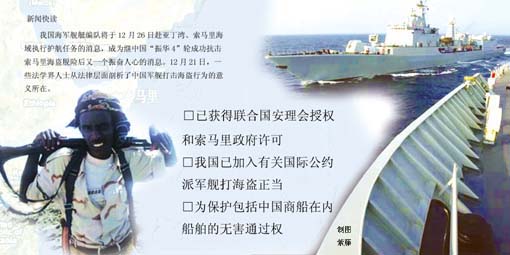中央軍委法制局有關(guān)負(fù)責(zé)人在接受媒體采訪時(shí)說(shuō),中國(guó)軍艦赴亞丁灣、索馬里海域?qū)嵤┳o(hù)航的行動(dòng),是根據(jù)聯(lián)合國(guó)安理會(huì)決議作出的決定,完全符合有關(guān)國(guó)際法的規(guī)定。
