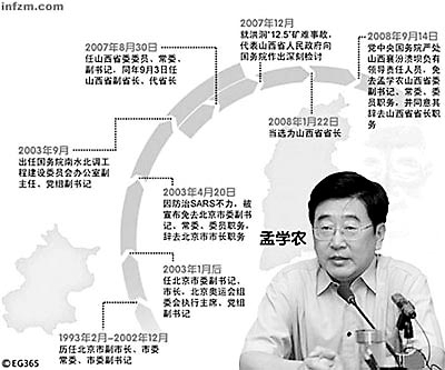 9月8日,山西省襄汾縣新塔礦業(yè)有限公司尾礦庫發(fā)生特別重大潰壩事故,事故發(fā)生的一個重要原因是當?shù)卣坝嘘P部門監(jiān)督管理不得力。9月14日,孟學農引咎辭去山西省省長職務。這是孟學農第二次引咎辭職。