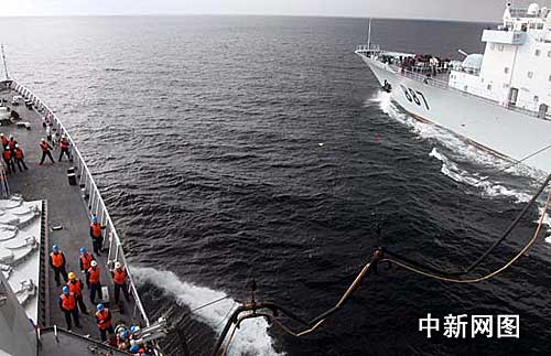 中新社“?凇迸烋R六甲海峽十二月三十日電 (記者 孫自法)中國海軍赴亞丁灣、索馬里海域護航艦艇編隊,三十日下午在馬六甲海峽順利完成首次海上綜合補給。(完)