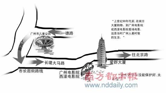 離開兒童公園,張廣寧沿人民南路向南走去。當看到廣州電影院和西濠電影院的招牌時,張廣寧還回憶說,上世紀90年代前,在南方大廈購物、到廣州電影院或西濠電影院看場電影,這是當時廣州人最時髦的生活。眼前,廣州電影院已變成一家KTV,而西濠電影院則變成了一家網(wǎng)吧。見此情此景張廣寧立即要求致電主管部門,了解這幾家老字號的產(chǎn)權(quán)及消失原因。