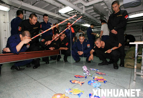 這天晚上是農(nóng)歷新年后的第一個(gè)月圓之夜,人們往往視元宵為新春佳節(jié)的最后一天。為豐富大家的文化生活,編隊(duì)利用護(hù)航間隙組織了一場(chǎng)游園活動(dòng)。地點(diǎn)設(shè)在士兵餐廳和兩個(gè)活動(dòng)室,項(xiàng)目包括蒙眼敲鑼、猜燈謎、釣魚、吹乒乓球、投飛鏢等,獎(jiǎng)品是瓜子、花生等水兵喜愛的小食品。