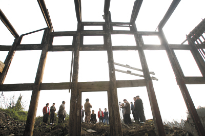 昨天上午,在劉伯承元帥的侄孫劉武青陪伴下,開縣近20名父老在舊居前緬懷劉帥。記者在現(xiàn)場(chǎng)看到,舊居左邊一間屋子的兩層樓全部被拆成光架架,幾根碗口粗的圓木和幾段斷壁殘?jiān)铝懔愕伛盗⒃诨慕贾。右邊二樓的木質(zhì)窗戶早已殘缺不全,樓下具有巴渝民間建筑特色的雕花窗格,也遭到盜賊光顧,部分用竹篾條加石灰制作的墻面,在風(fēng)吹雨打中也早已斑駁脫落。