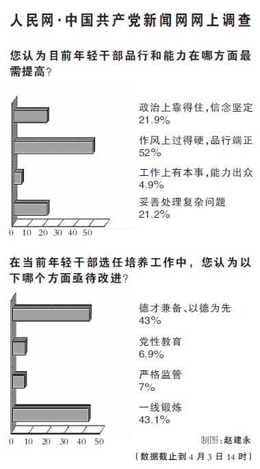 截至4月3日,人民網(wǎng)·中國(guó)共產(chǎn)黨新聞網(wǎng)推出的一項(xiàng)針對(duì)年輕干部的網(wǎng)上調(diào)查顯示:93.6%(1853票)的網(wǎng)友認(rèn)為“目前大多數(shù)年輕干部工作經(jīng)歷偏單一”; 43.1%(1095票)的網(wǎng)友認(rèn)為應(yīng)“樹立注重基層導(dǎo)向,堅(jiān)持多崗位、在基層一線的實(shí)踐中培訓(xùn)鍛煉年輕干部”。