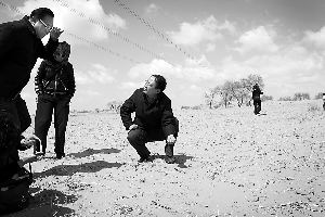郭虎帶著氣象臺的年輕預(yù)報員,進入一處沙地。當(dāng)時風(fēng)很大,吹得大家睜不開眼睛,“瞬間風(fēng)力能達到五六級!辈贿^,沒有沙塵。郭虎蹲下去,用手抓起一把沙子,一松手,沙子被吹出不遠就飄落了!斑@說明沙子里的水分很多!惫⒂檬峙倨鹕匙觼,深不到1厘米的表層下,沙子都是濕的。