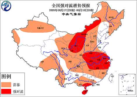 中新網(wǎng)6月17日電 中央氣象臺18時(shí)發(fā)布強(qiáng)對流天氣預(yù)報(bào),預(yù)計(jì)今天夜間到明天白天,新疆北部和西南部、西北地區(qū)東部、內(nèi)蒙古大部、華北大部、東北大部、青藏高原東部、西南地區(qū)西南部和東北部、黃淮大部、湖北、江淮、江南大部、華南中南部等地將有雷暴天氣,其中,甘肅東部、寧夏、陜西北部、內(nèi)蒙古中東部地區(qū)局地有冰雹、短時(shí)強(qiáng)降水、雷雨大風(fēng)等強(qiáng)對流天氣,河南南部、安徽、江蘇大部、湖北大部、湖南東北部、江西北部、浙江、上海、福建北部、廣西東南部、廣東西南部、海南局部有短時(shí)強(qiáng)降水、雷雨大風(fēng)等強(qiáng)對流天氣。