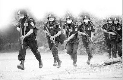 經(jīng)過1小時(shí)的現(xiàn)場處置,當(dāng)?shù)鼐綄ⅰ翱植婪肿印眹?yán)密封控在工廠一區(qū)域內(nèi)。但“恐怖分子”沒有絲毫棄械投降的意思,仍舊挾持人質(zhì)與警方對峙,并威脅炸毀化工設(shè)施。此時(shí),接到報(bào)警的河北省反恐指揮中心迅速啟動(dòng)省級反恐預(yù)案,成立省級反恐指揮部,并派省級公安特警、武警、消防、衛(wèi)生、氣象和環(huán)保力量,迅速趕往涿州現(xiàn)場增援處置。與此同時(shí),國家也緊急調(diào)派國家反恐應(yīng)急處置力量——— 武警“雪豹突擊隊(duì)”和解放軍“三防醫(yī)學(xué)救援隊(duì)”前往現(xiàn)場增援。