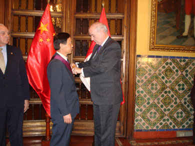 中新網(wǎng)6月23日電 據(jù)中國外交部網(wǎng)站消息,6月22日,秘魯外長加西亞向即將離任的中國駐秘魯大使高正月授予秘魯太陽大十字級(jí)勛章。我館政務(wù)參贊虞越、秘第一副總統(tǒng)詹彼得里、外貿(mào)旅游部長阿勞斯、部分政界高官、國會(huì)議員、駐秘使團(tuán)代表、企業(yè)界等各界友好人士等50多人出席。
