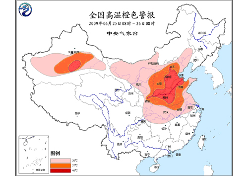 中新網(wǎng)6月25日電 據(jù)中國(guó)氣象局網(wǎng)站消息,中央氣象臺(tái)今天早晨六點(diǎn)鐘繼續(xù)發(fā)布高溫橙色警報(bào):預(yù)計(jì),今天白天,華北大部、黃淮、江淮、江漢、江南北部及陜西大部、寧夏中北部、甘肅北部、內(nèi)蒙古中西部和新疆南疆盆地有35℃以上的高溫,其中,河北大部、京津、山西大部、山東大部、陜西東部、河南、安徽中北部、江蘇西北部及南疆盆地東部等地最高氣溫可達(dá)37~39℃,河北中南部、京津南部、河南中北部、山西南部、山東西部及南疆盆地東部等地局部氣溫可達(dá)40℃。