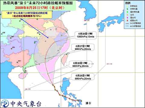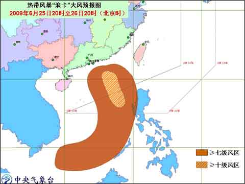 預(yù)計(jì),風(fēng)暴中心將以每小時(shí)15-20公里的速度向西北方向移動(dòng),以后將轉(zhuǎn)向偏北方向移動(dòng),逐漸向廣東中部到福建南部一帶沿?拷瑥(qiáng)度有所加強(qiáng),并有可能于明天夜間到后天白天在這一帶沿海登陸。受“浪卡”和西南季風(fēng)的共同影響,今天晚上到明天白天,南海東部和南部海面將有6-8級大風(fēng),“浪卡”中心經(jīng)過的附近海面的風(fēng)力可達(dá)9-10級。