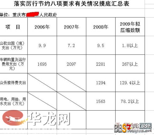 網(wǎng)友曝出的這份某區(qū)“落實(shí)厲行節(jié)約八項(xiàng)要求有關(guān)情況摸底匯總表”顯示,2006年,重慶某區(qū)政府在公車購(gòu)置及運(yùn)行費(fèi)用一項(xiàng)上花掉了1693萬元,此后兩年開銷不見回落,至2008年已高達(dá)2281萬元。今年,政府厲行節(jié)約八項(xiàng)要求,“勒緊公款腰包”,公車一項(xiàng)亦擬花2000萬左右。除此之外,該區(qū)政府去年于公款出國(guó)(境)支出9.5萬元,公務(wù)接待用了1294萬元,用電、用水、用油花了1563萬。如此巨額公費(fèi)開支,令人震驚。
